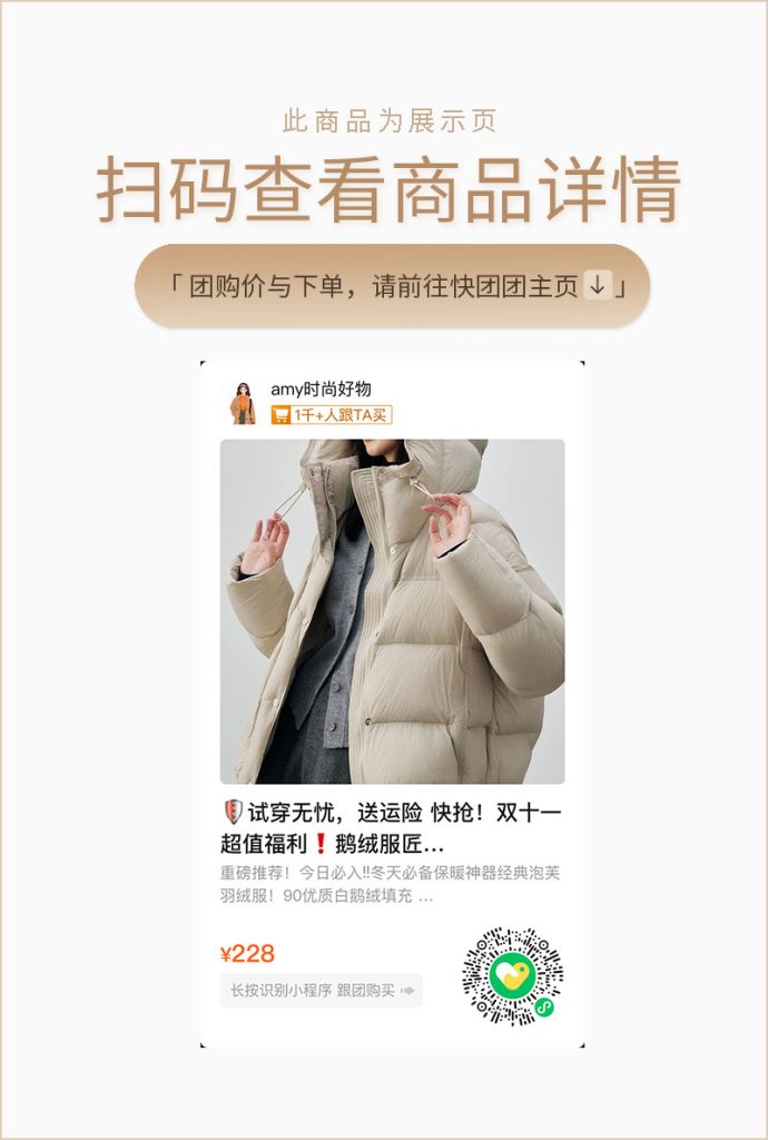 🛡️试穿无忧,送运险 快抢!双十一超值福利❗️鹅绒服匠心之作【AUChris云感泡芙鹅绒服】一裹就出门的“鹅绒被”厚实而丰满❗️超重磅❗保暖效果是普通羽绒起码两倍,性价比极高! □泡芙感超细腻面料+顶尖白鹅绒,舒适顺滑分量轻 □创新充绒工艺,360°包裹温暖,告别寒冷死角! □保暖遮肉又显瘦!百搭不挑人! 💰某宝价1383¥/件,开团价228¥/件,立省1155¥ 服饰鞋包